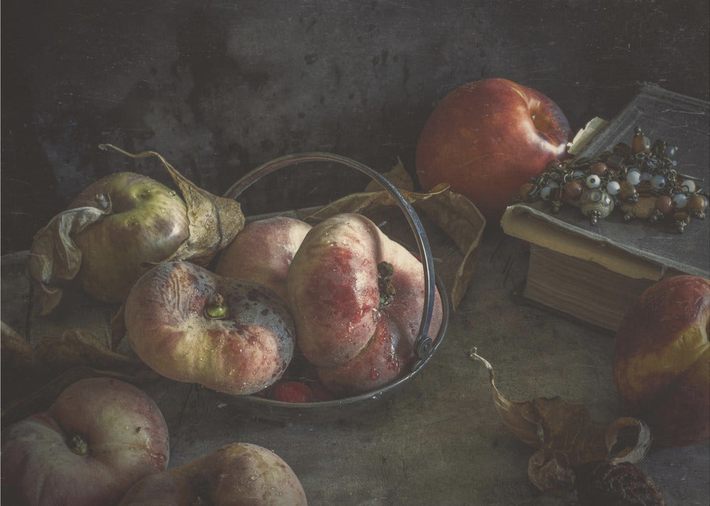 Stilleben med bog og ferskner | Plakater - Kunsttryk