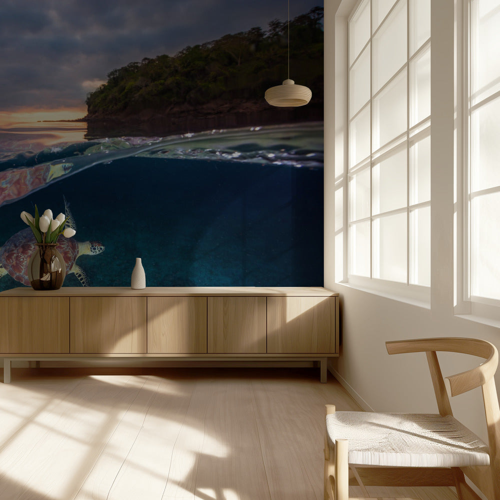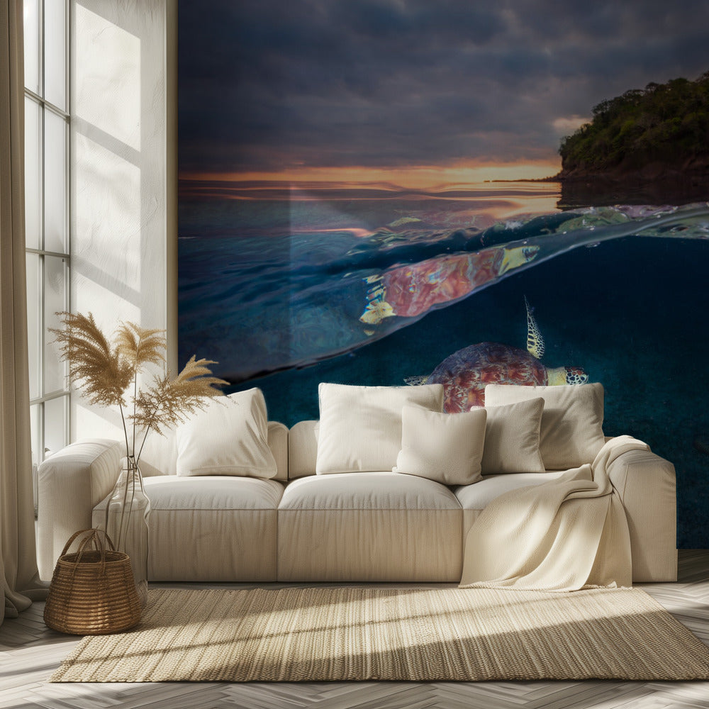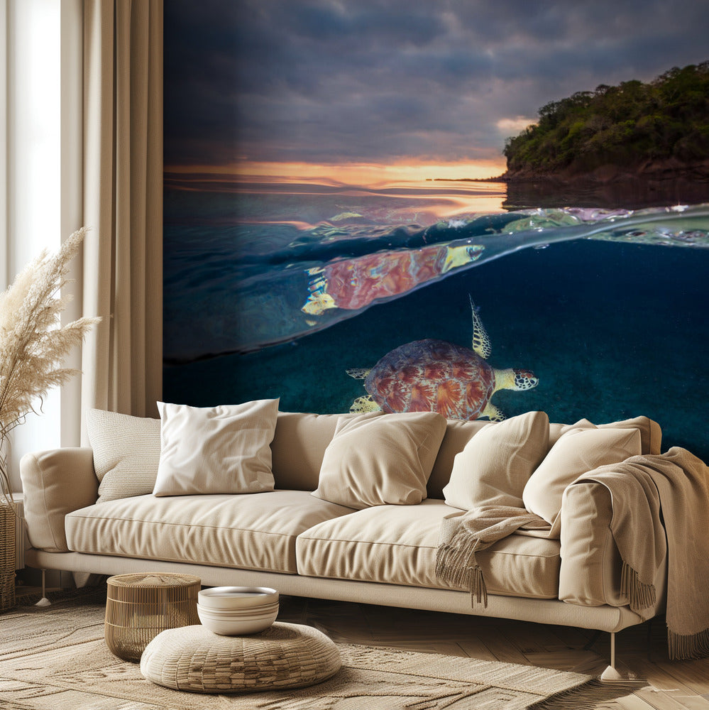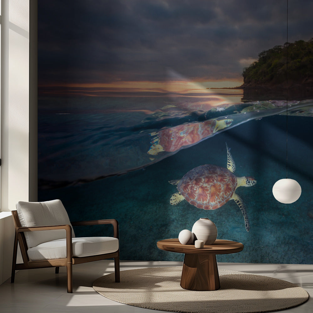 Tortuga verde con puesta de sol | Papel Pintado Fotográfico