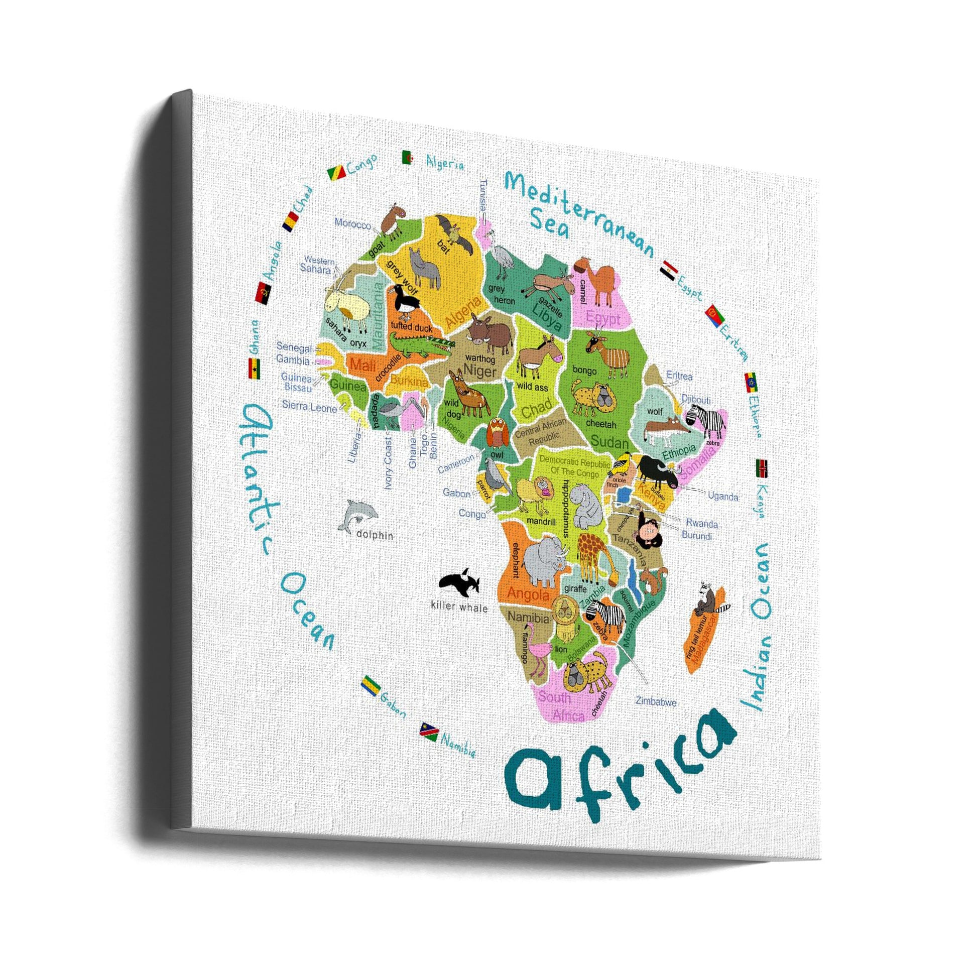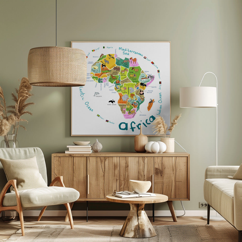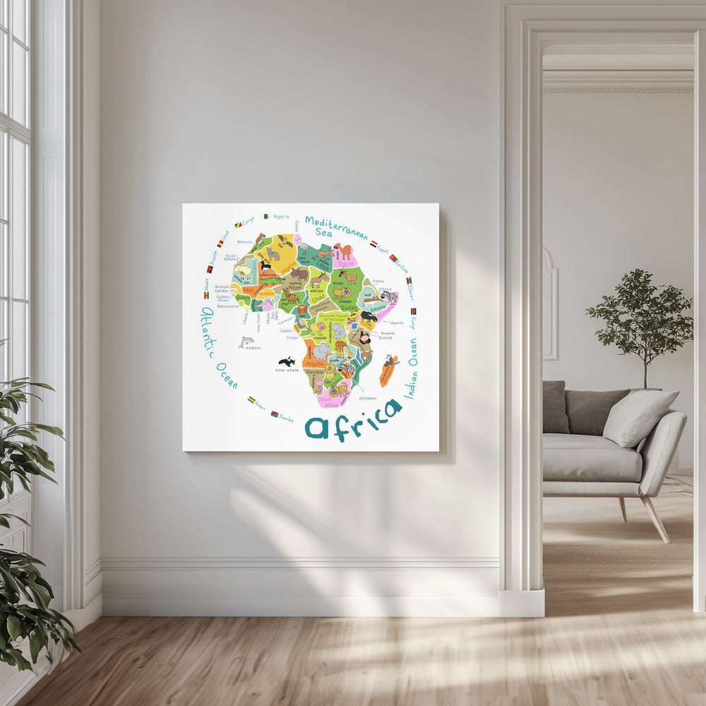 Kuvitettu Afrikan kartta maineen ja söpöine eläimineen, kirjoittanut Carla Daly | Canvastaulut