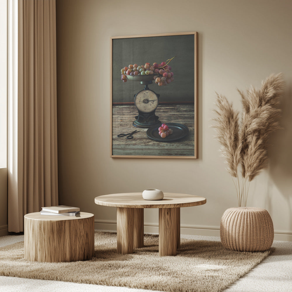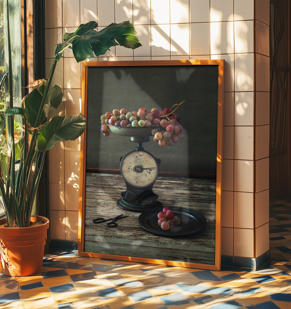 Asetelma viinirypäleillä vaa'alla | Julisteet - Taidevedokset