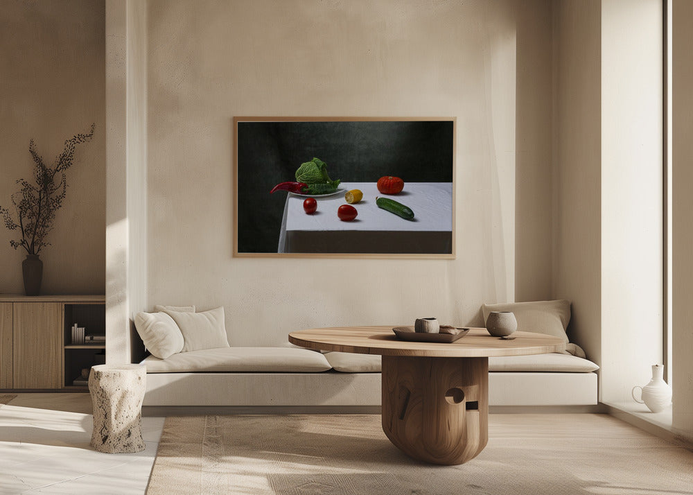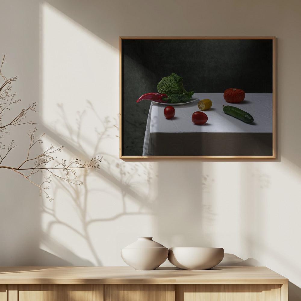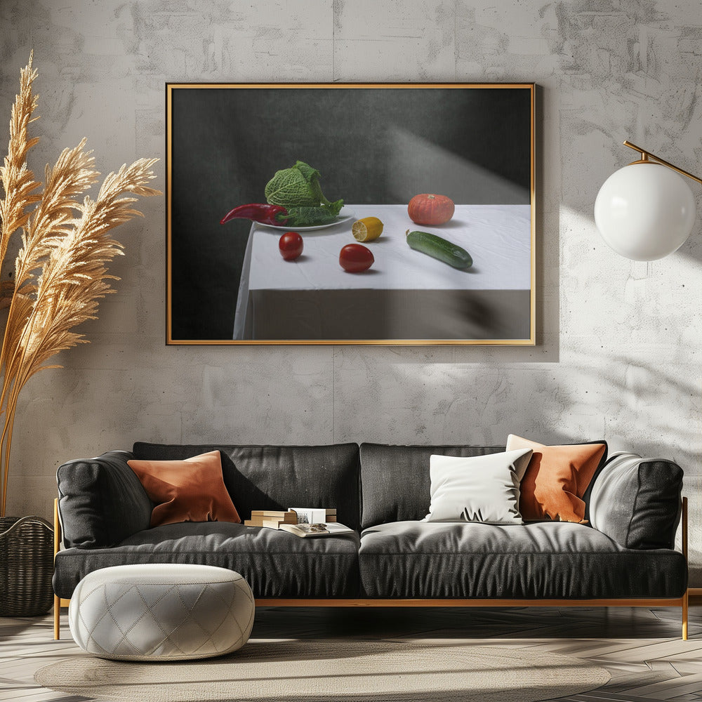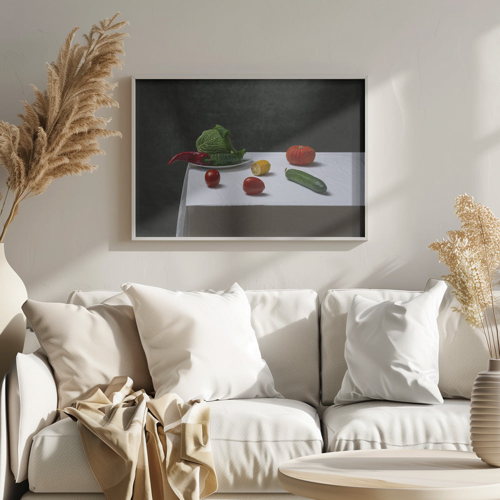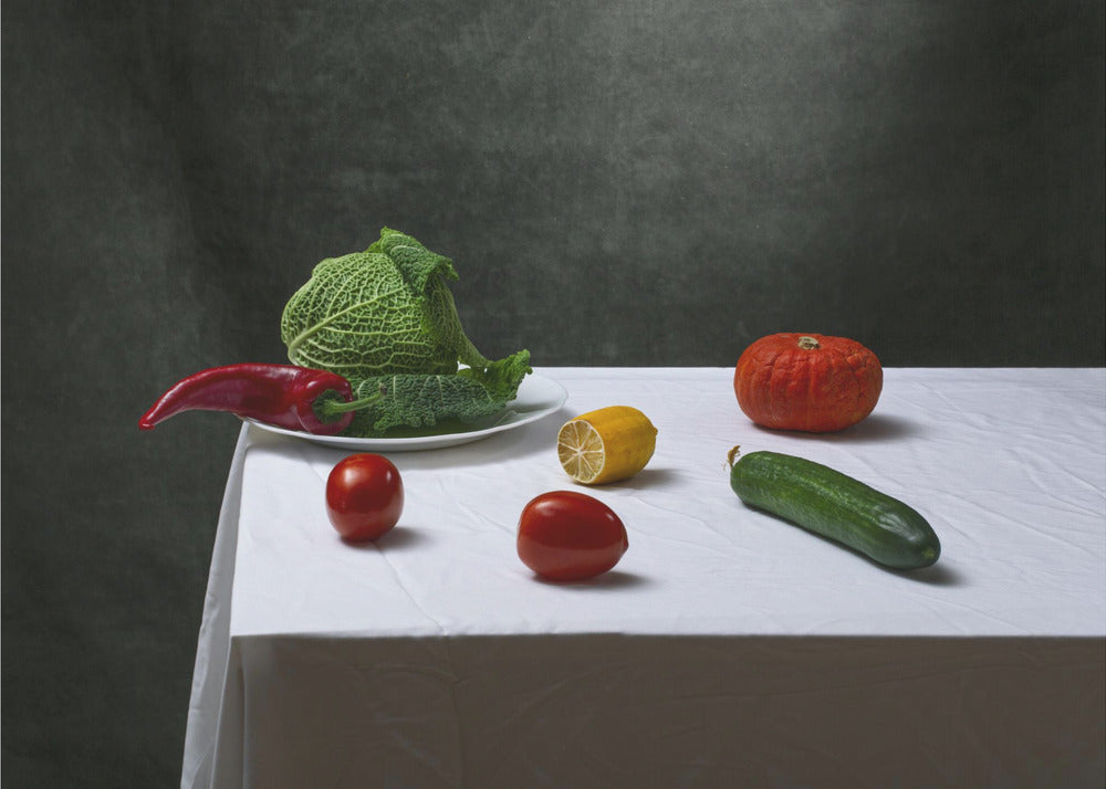 Asetelma savoijinkaalilla, tomaateilla, kurkulla, paprikalla, sitruunalla ja kurpitsalla | Julisteet - Taidevedokset