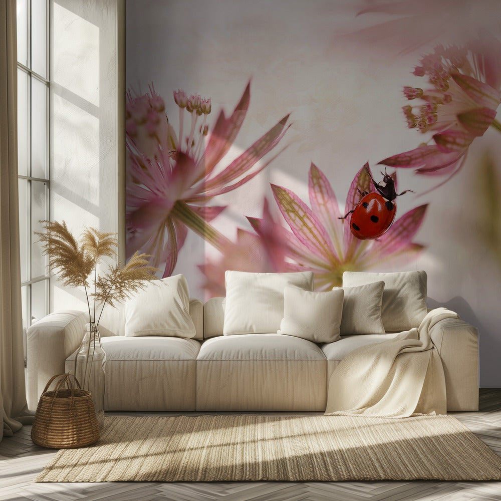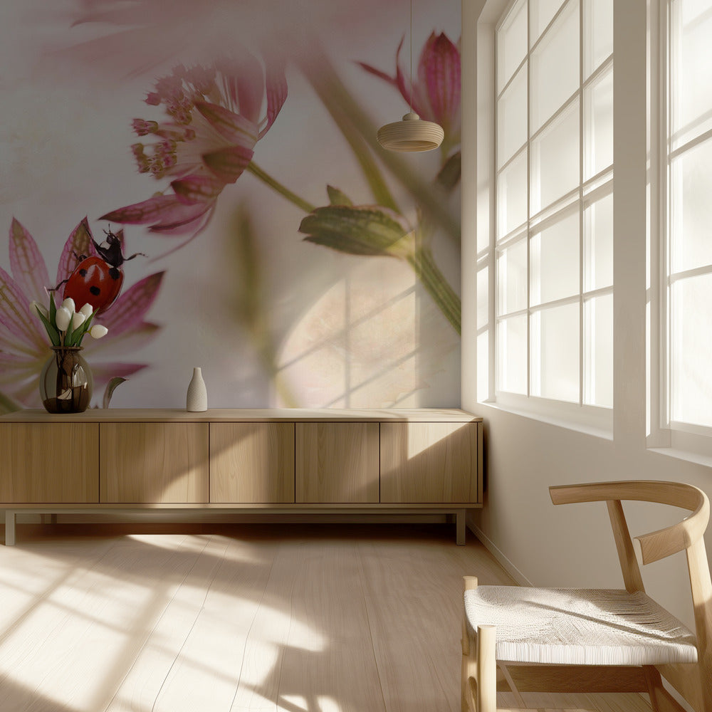 Coccinella e fiori rosa | Carta da Parati Fotografica